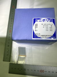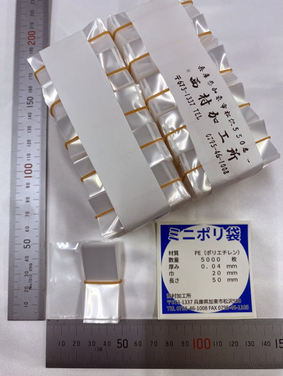 透明度・柔軟性があり幅広く使用されている素材です商品名① 材質 寸法(厚×巾(口径)×長さ)mm 販売数量(枚) 税込価格(円) ミニポリ袋 PE(透明) 0.04mm×20mm×50mm 5000枚 3600円 ⇒FAX 注文用紙 メール