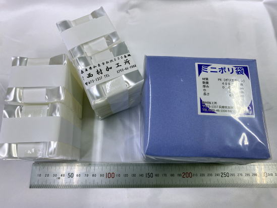 商品名② 材質 寸法(厚×巾(口径)×長さ)mm 販売数量(枚) 税込価格(円) ミニポリ袋 PE(透明) 0.04mm×50mm×60mm 4000枚 2025円